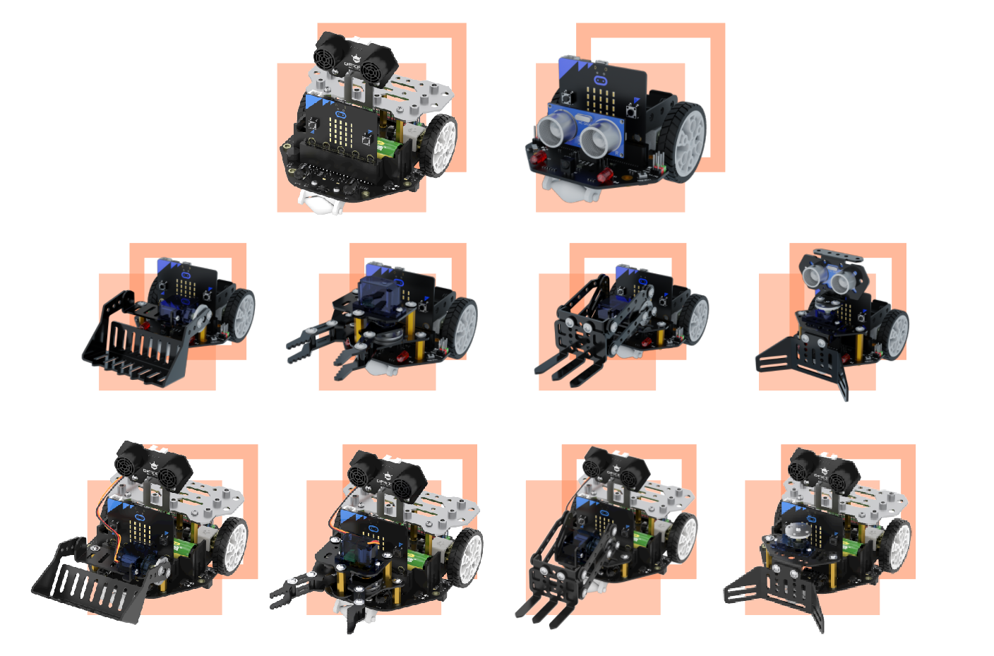 The Maqueen also supports attaching various actuators or mechanisms to interact with the real world. Below you can see a preview of some of the available attachments.