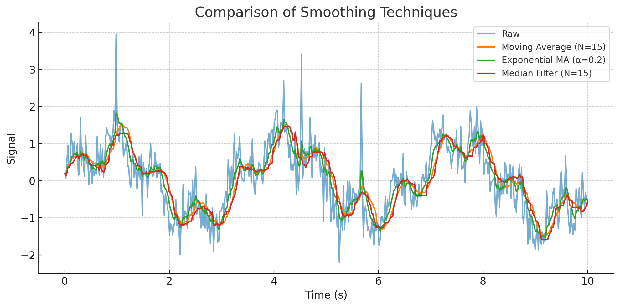 One of the simplest methods is a moving average, where the program remembers the last few samples and calculates their mean. Random spikes disappear, and the signal becomes easier to use. The trade-off is that the output reacts more slowly to sudden changes.