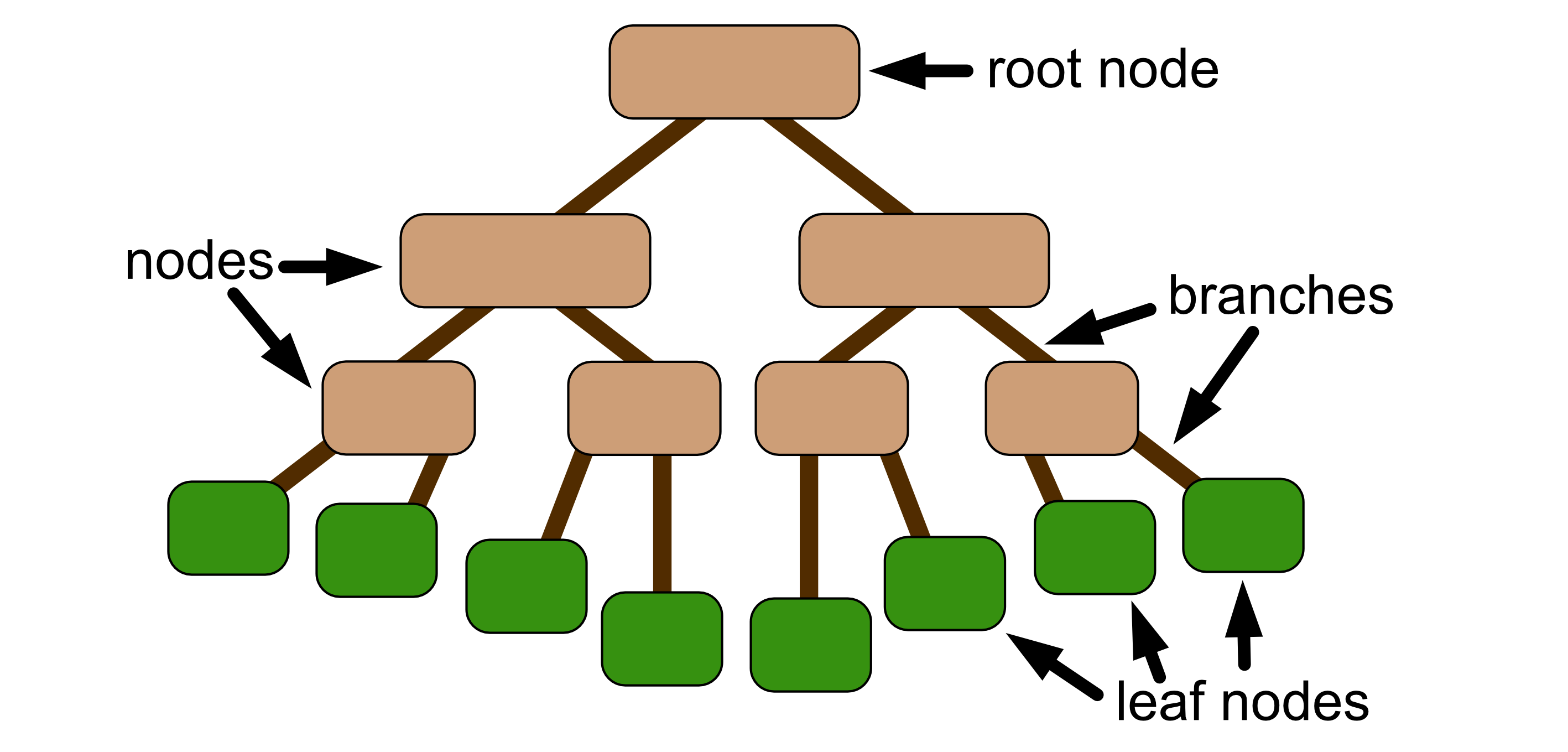 Decision trees are graphical trees that represents a decision making process. The tree is made up of nodes and branches. Each node represents a decision point and each branch represents the decision that is taken. The node at the top of the tree is called the root node, and this is the starting point of the tree. The nodes at then end (which do not have branches) are called the leaf nodes and they represent the final outcome/decision. This means a decision tree looks a bit like an upside down tree.