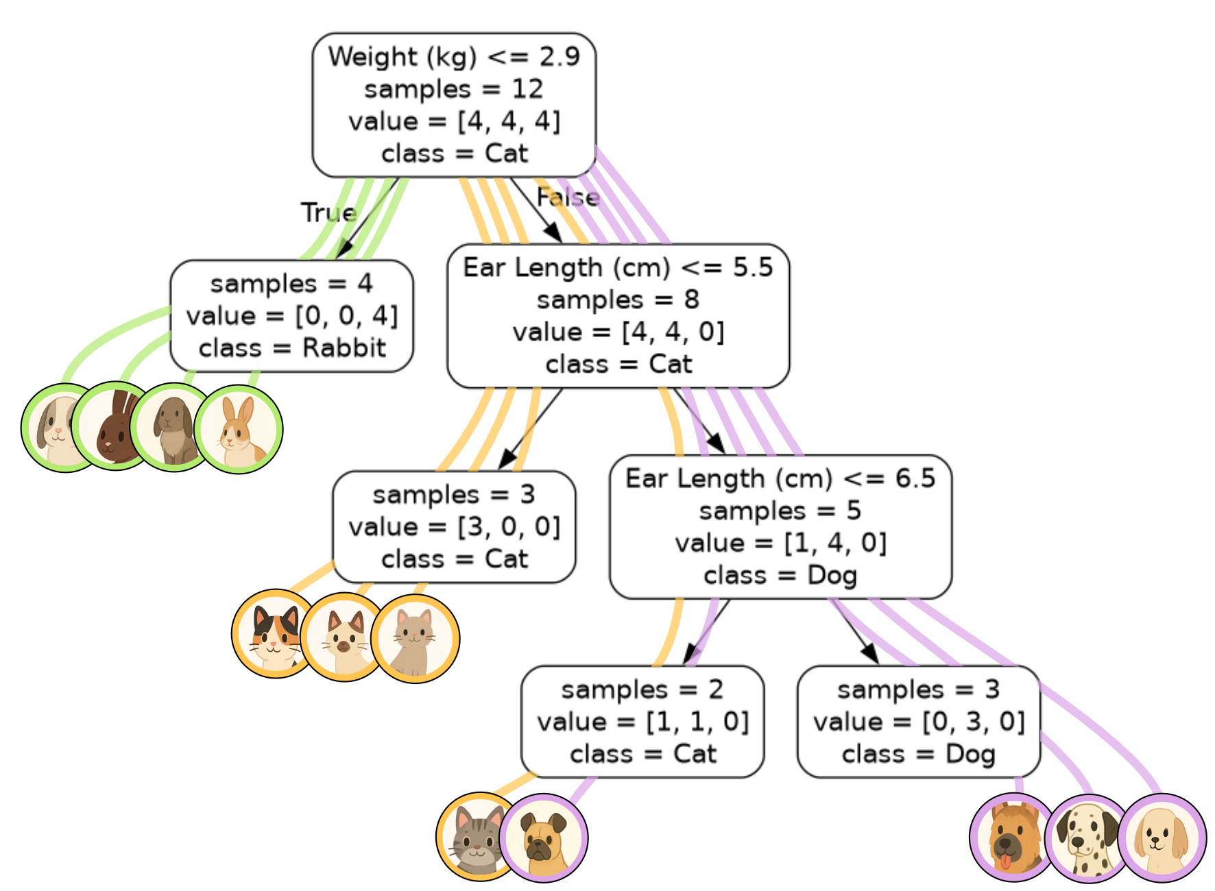 Ear Length (cm) <= 6.5is the decision associated with the node.samples = 5means that 5 samples have ‘flowed’ through this node. This corresponds to the 5 lines passing through the node in our visualisation.value = [1, 4, 0]tells you that there were 1 cat, 4 dogs and 0 rabbits that ‘flowed’ through this node. Again, you can tell by the colours of the lines. There is one yellow line for the cat and 4 purple lines for the dogs. The order of the list corresponds to the order of the class labels. In our case we had 1: cat, 4: dog, 0:rabbit.class = Dogmeans that the majority of the samples passing through this node belong to the dog class. In instances where there is a tie between classes, the class associated with the lowest number will be selected. E.g.[4, 4, 0]has equal cats (0) and dogs (1), so we default to cats.