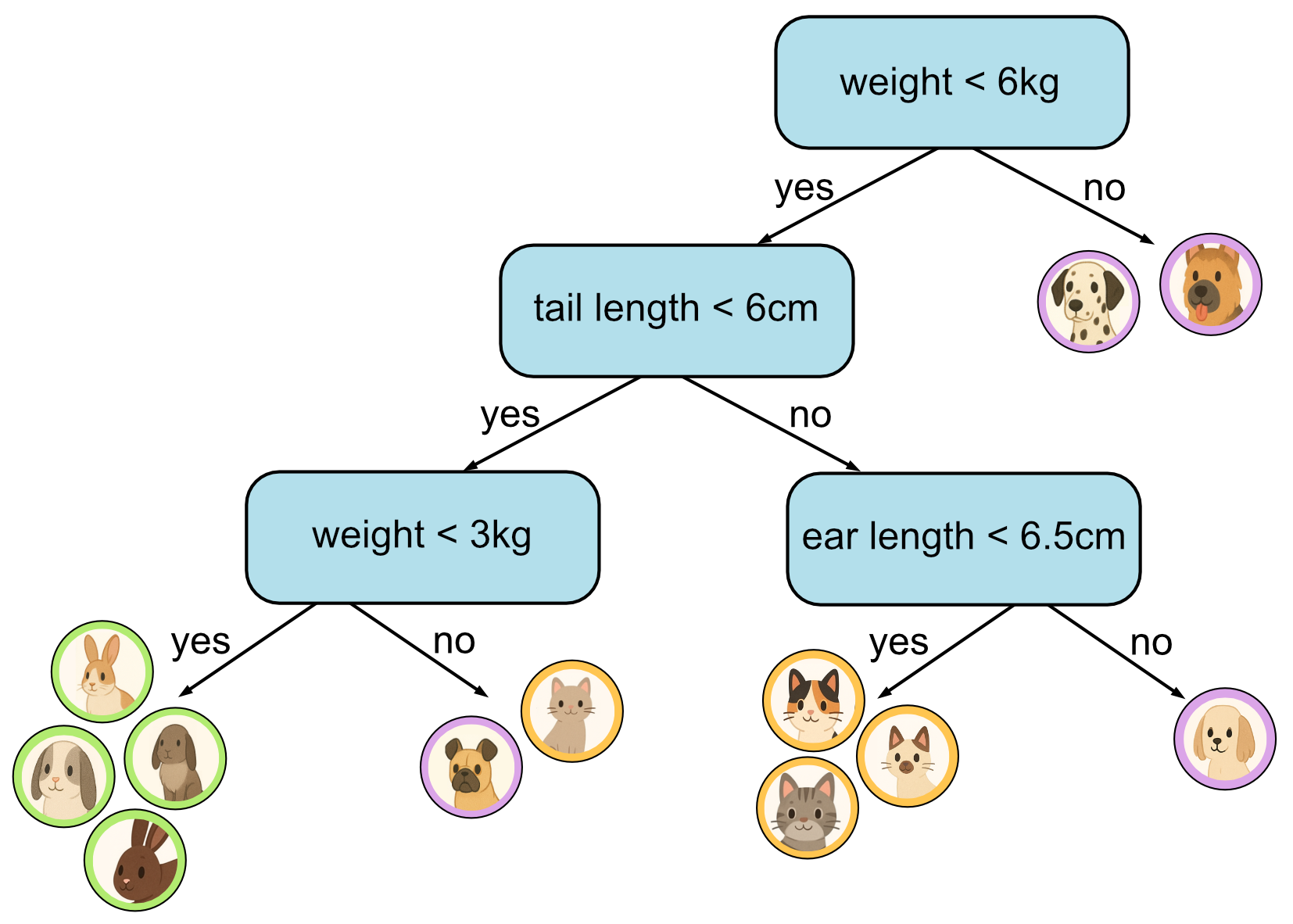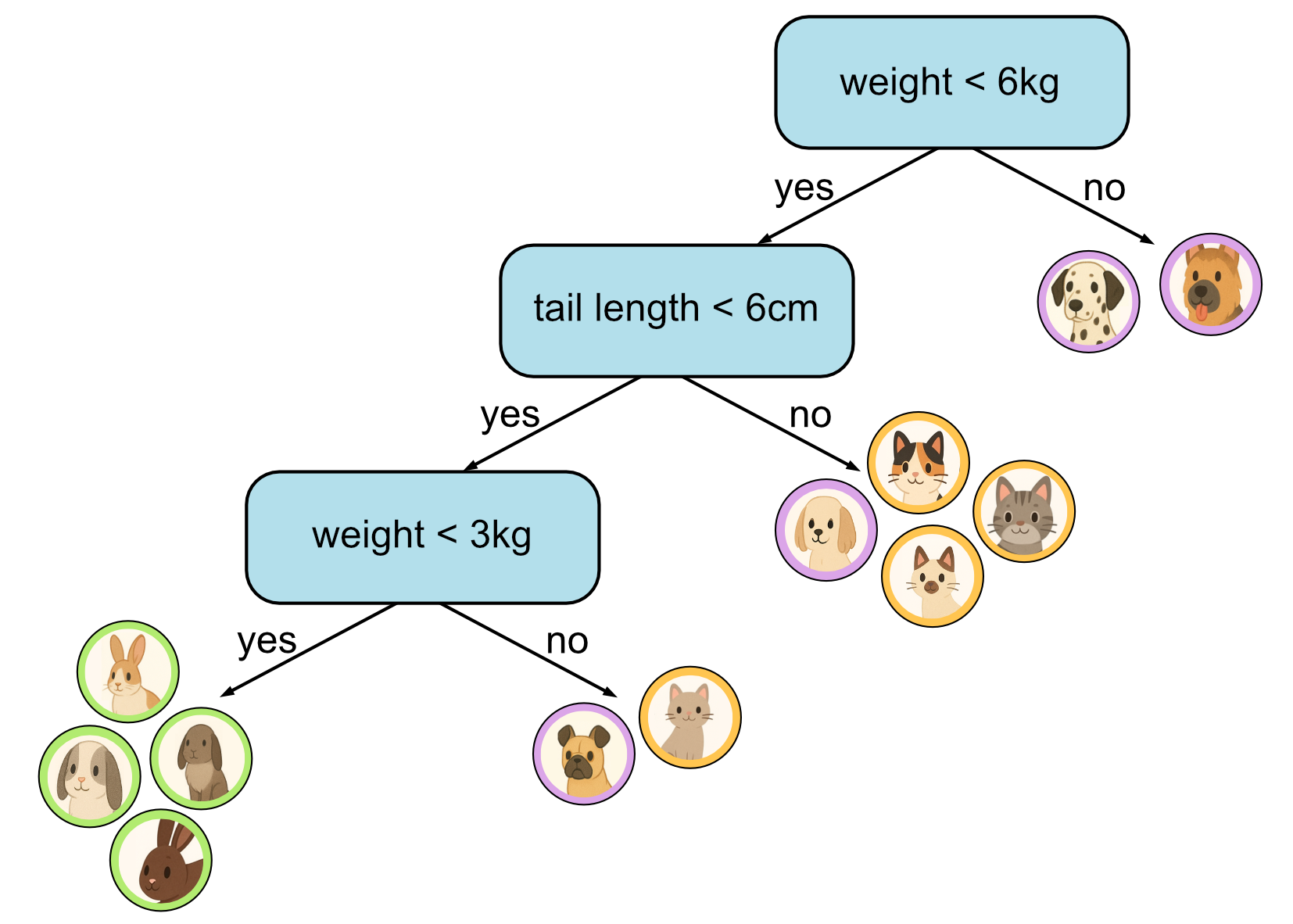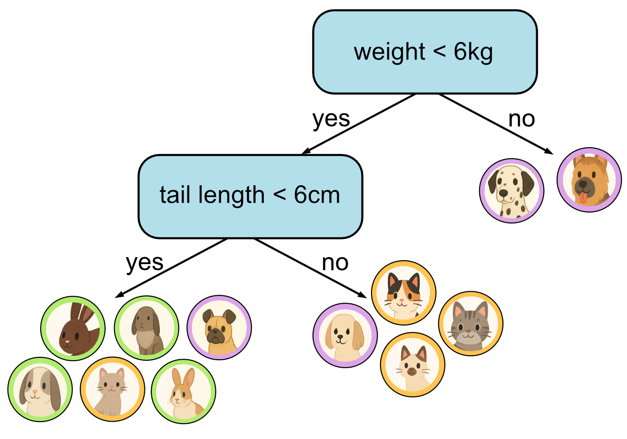 What you’ll notice is though is that this time some of our decisions don’t lead to a leaf node with a single class. This is what we call an impure node. If there are more training samples from one class that end up in this node, we label this node with the majority class. E.g. if there were two cats and one dog, we’d label this cat. In this example however, there are an equal number of dogs and cats. This is less likely to happen when there is more training data, but in this case we can choose randomly, each is equally valid. For this example, we’ll just choose cat.