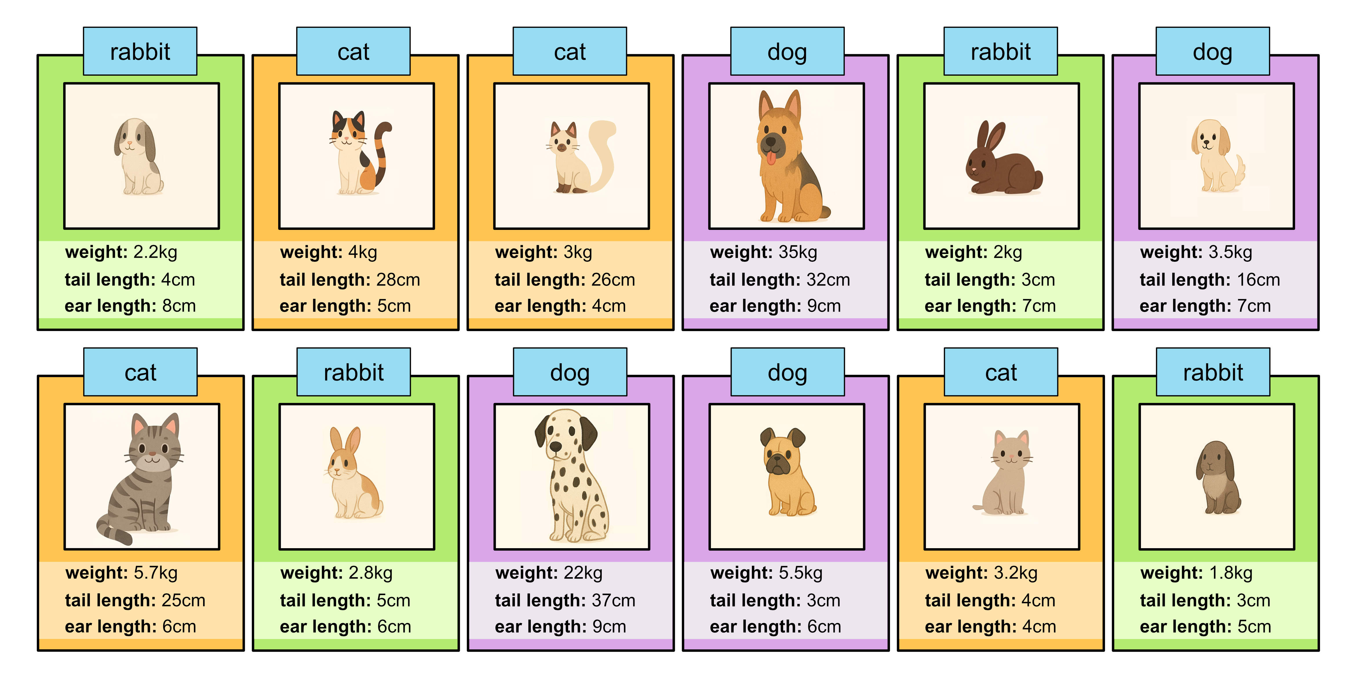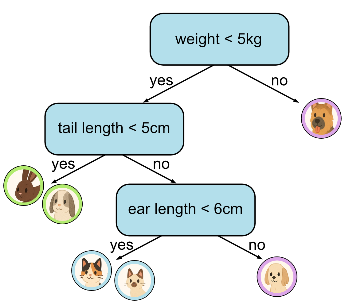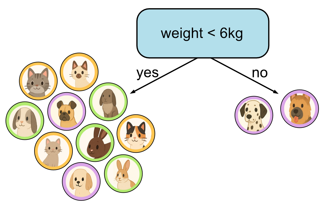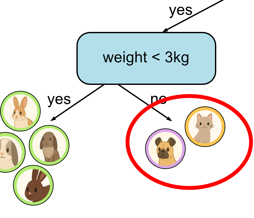 What you’ll notice is though is that this time some of our decisions don’t lead to a leaf node with a single class. This is what we call an impure node. If there are more training samples from one class that end up in this node, we label this node with the majority class. E.g. if there were two cats and one dog, we’d label this cat. In this example however, there are an equal number of dogs and cats. This is less likely to happen when there is more training data, but in this case we can choose randomly, each is equally valid. For this example, we’ll just choose cat.