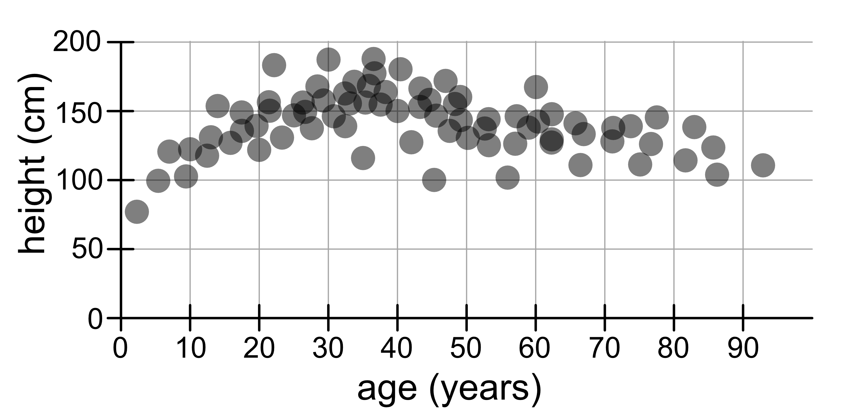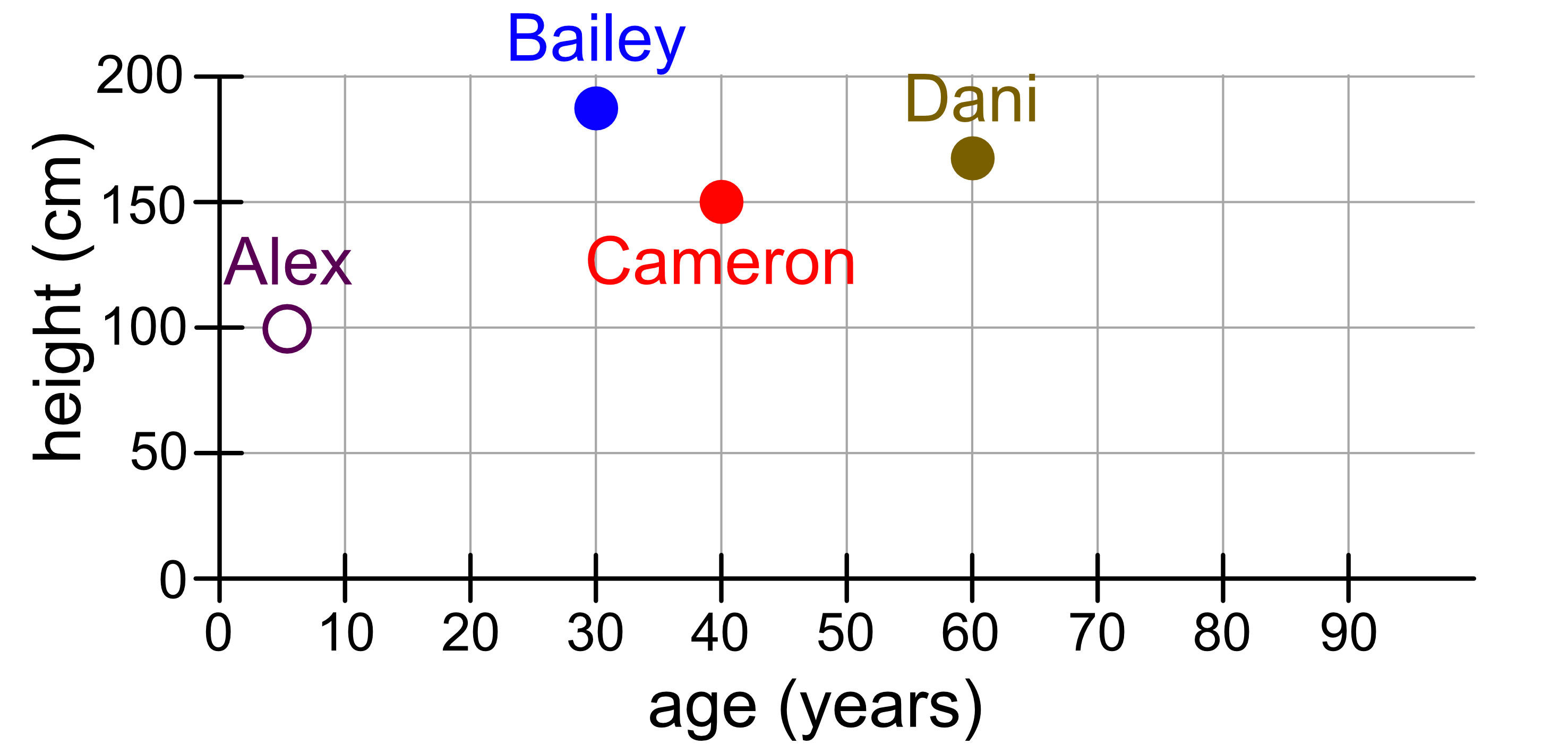 In general, if you consider a larger dataset, the points that are close together are similar in both age and height. The closer the points are, the more similar they are. If two people are similar in one variable but quite different in another variable (e.g. similar height but different ages), they won’t necessarily be close together.
