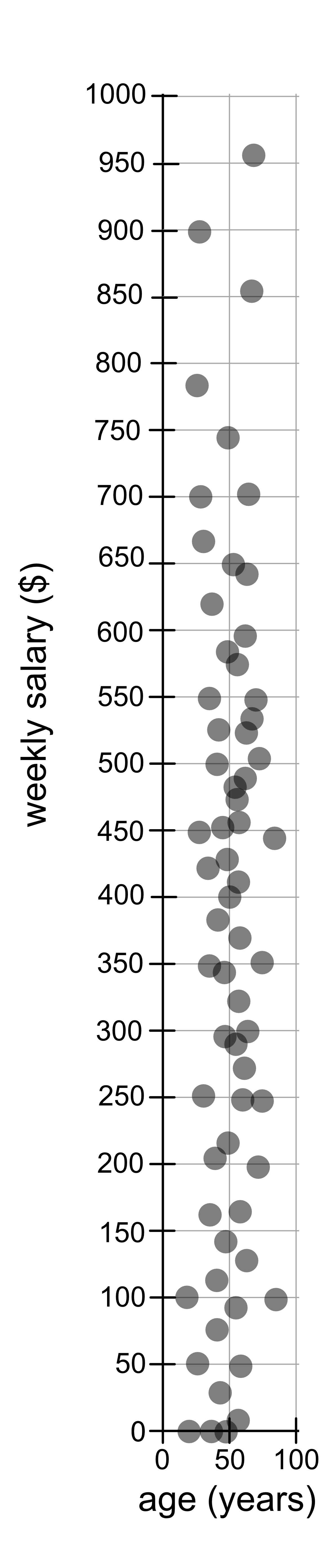 In the example we just saw, there is a problem with using pure distance to measure similarity. Age and years are quite similar in scale, in that age typically ranges from 0 - 100 years and height typically ranges from 0 - 200 cm. Other variables might be on a completely different scale. For example, age (0 - 100 years) and weekly salary ($0 - $1000). You will notice that each grid square represents 50 x 50 (years x $). Because the range of weekly salary values is so much larger than the scale of years, you’ll notice that the distance is dominated by the weekly salary variable and people tend to be close together if they have similar salaries, regardless of their age.