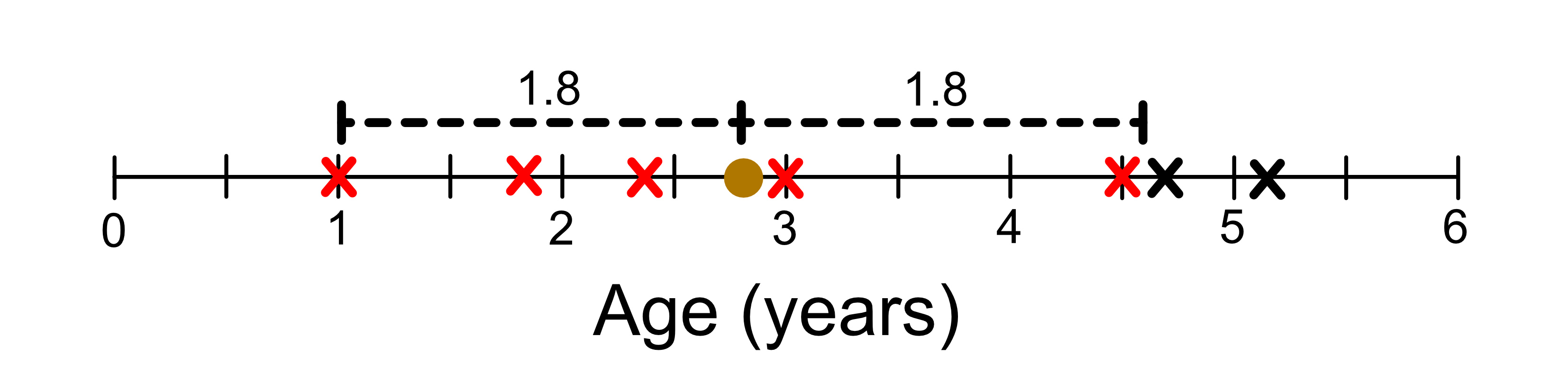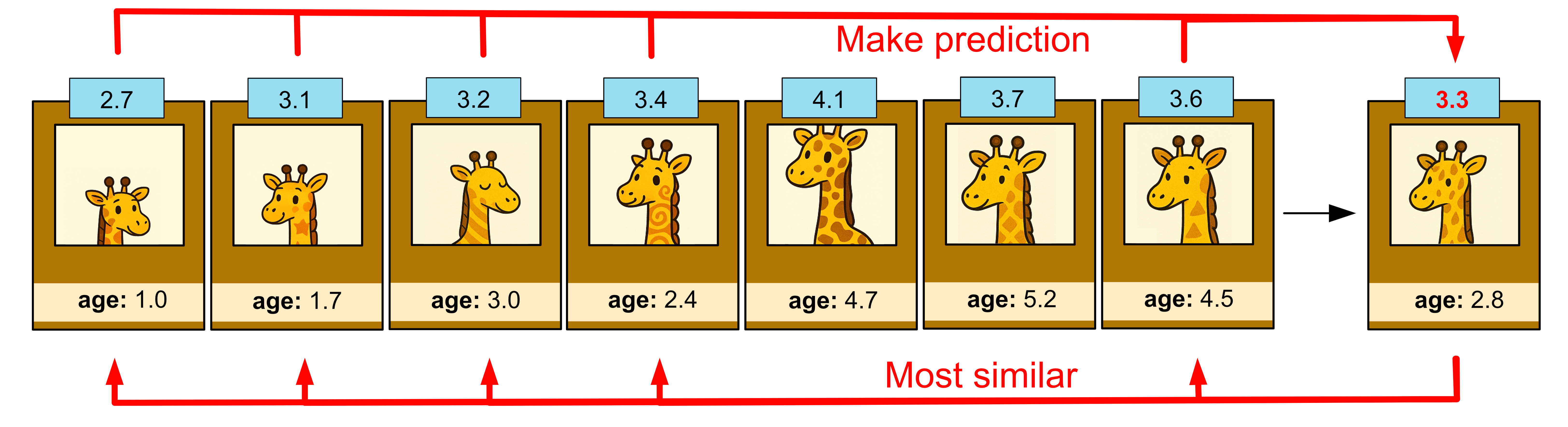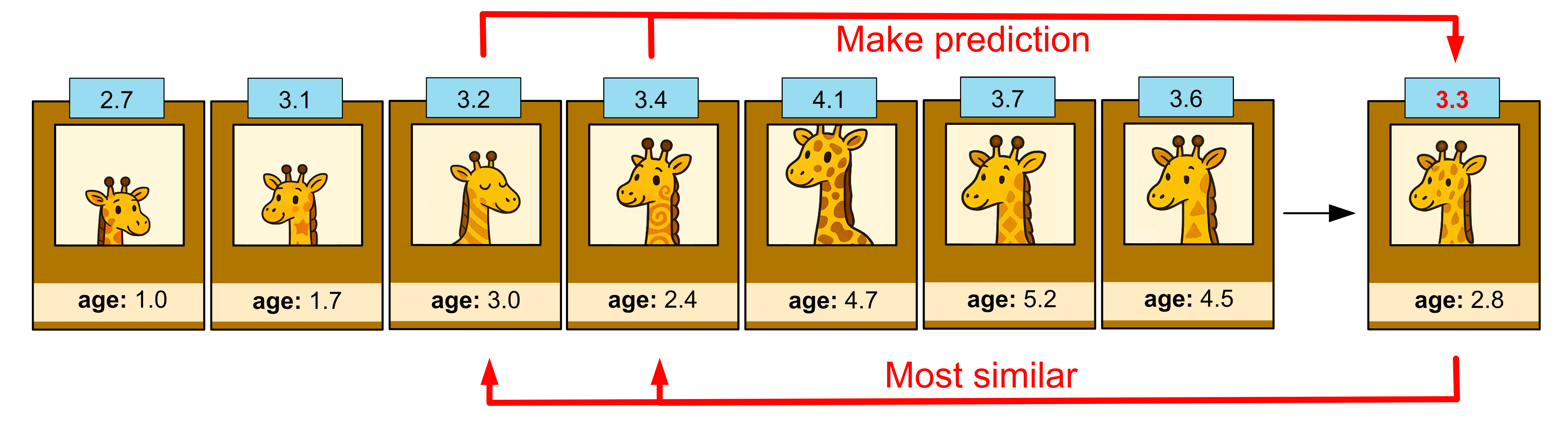 The two giraffes that are most similar in age are 2.4 and 3.0 years old. They have heights 3.2 and 3.4. The average of these values is 3.3, so we predict our giraffe is 3.3m tall.