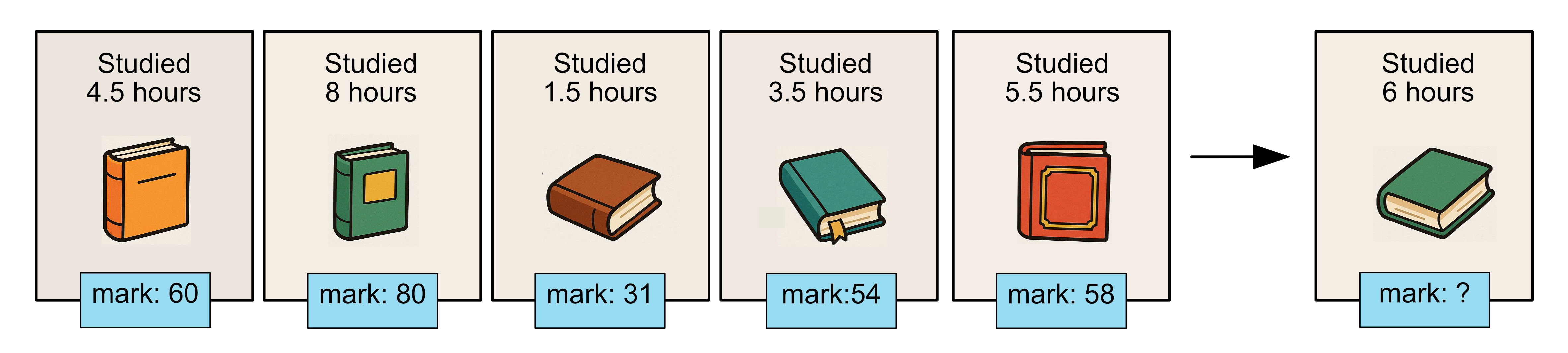 Using our model we can make predictions. For example, let’s estimate the mark of a student who has studied 6 hours for the exam. Using our model formula and plugging in \(x=6\), gives us: