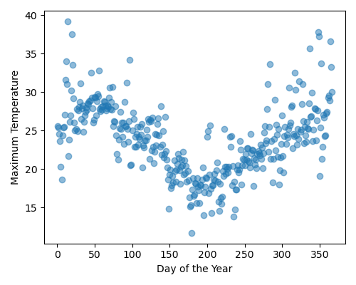 alpha = 0.5Have labels Day of the Year and Maximum Temperature