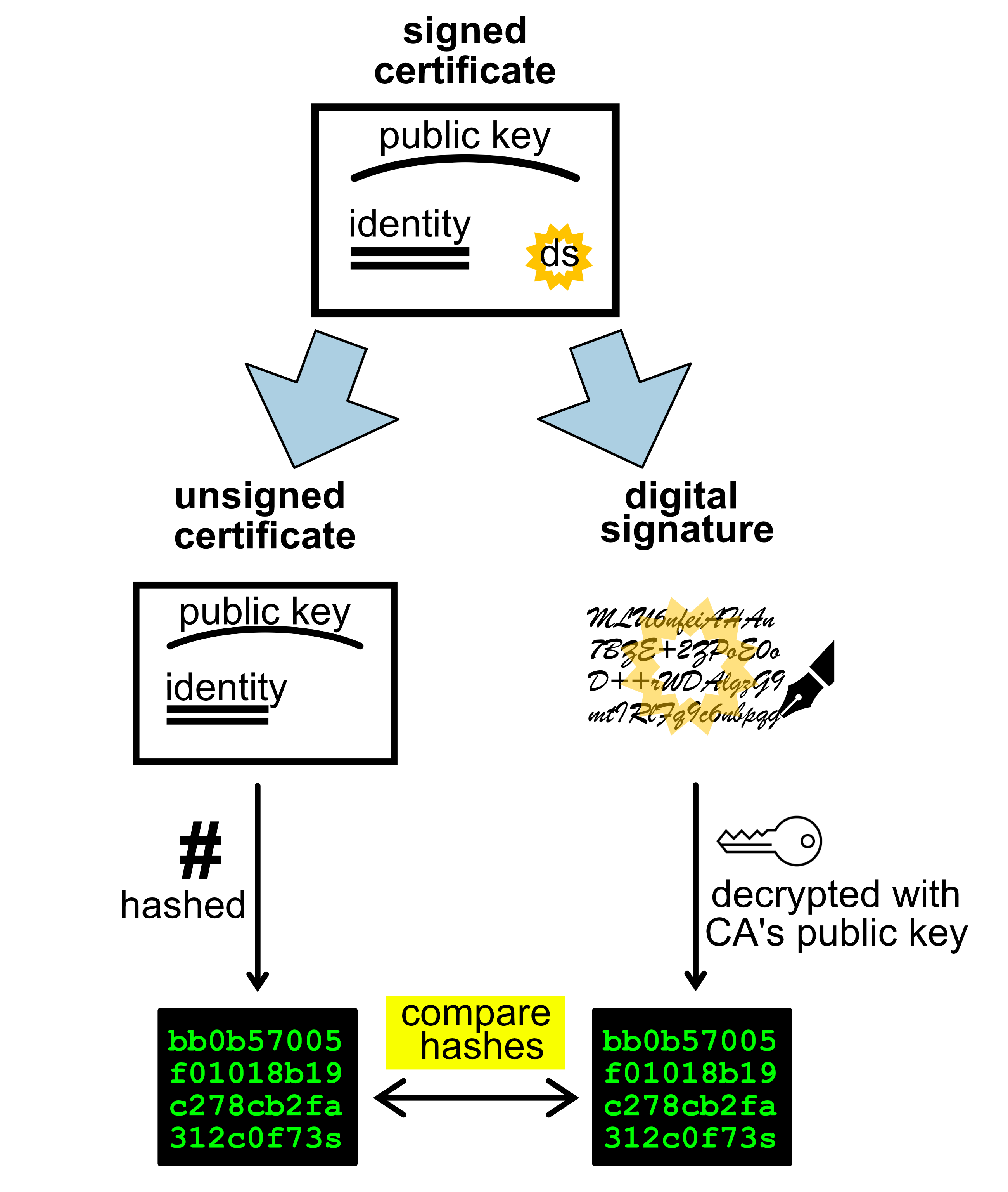 The client checks the validity of the certificate using the CA’s public key, thus confirming the identity of the server